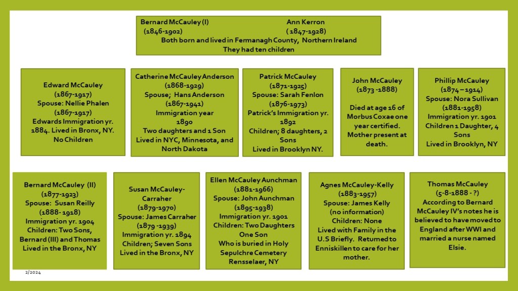 We will begin this journey using this chart as a frame of reference. This is a diagram of the McCauley nuclear family who resided in Fermanagh County, Northern Ireland, in the 1860’s. This is the family of Bernard McCauley (the first) and Ann Kerron (Sometimes spelled Kerrin or Carron). A local couple from that area. Together they had ten children. Seven of the children would later emigrate to America. Agnes McCauley would visit her siblings in America, but ultimately too up residence in Fermanagh to care for her mother. Agnes purchased a house on Henry Street in Enniskillen in the early 1920’s. Thomas McCauley would possibly go onto enlist as a soldier in WWI and settle in England. John McCauley would pass away at the age of 16 after a prolonged injury or illness.