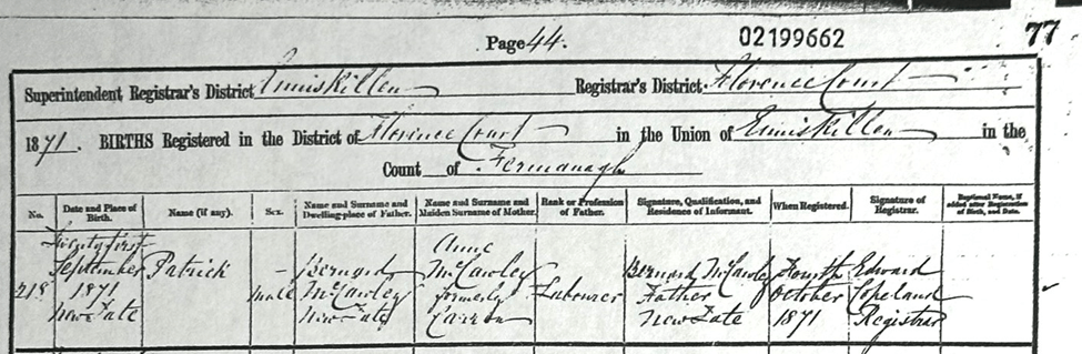 Patrick Joeseph McCauley (1871-1925) Civil Birth Entry below