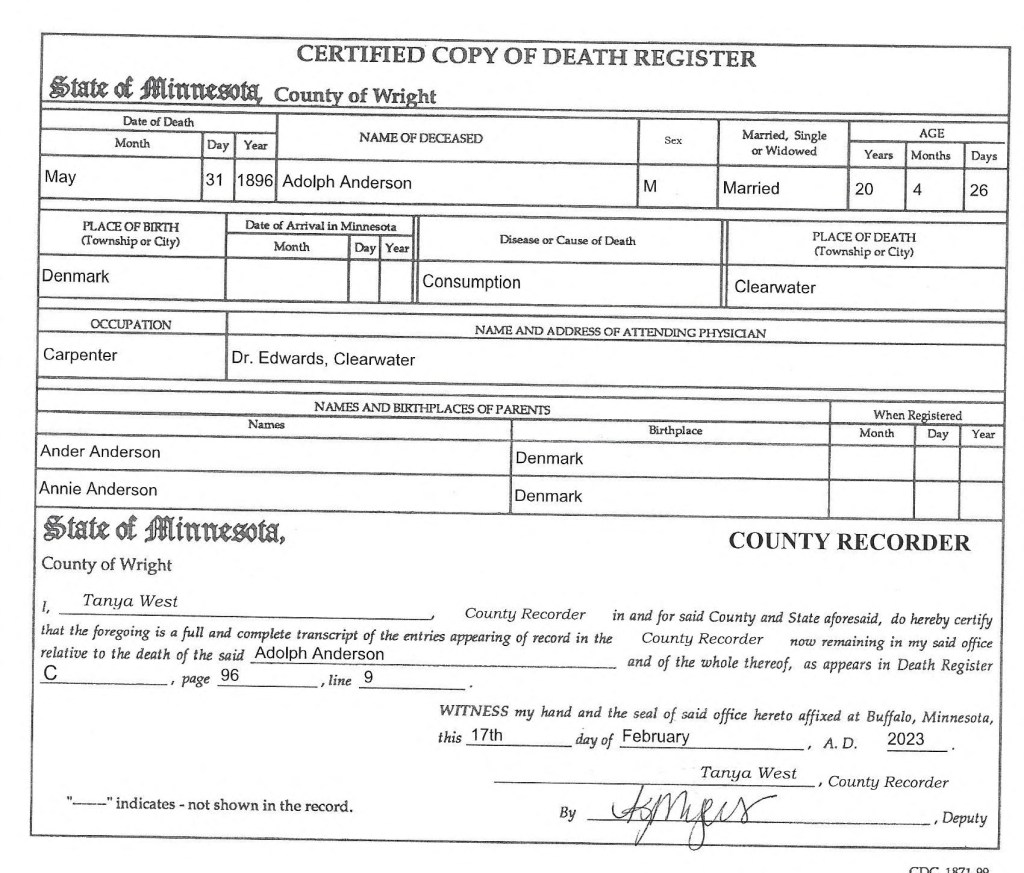 The family appears to have moved to Clearwater, Minnesota within a year after the marriage. My Understanding from the Anderson family is that Adolph died and after a time, Catherine married his younger brother Hans. I had looked for a death certificate for Adolph in the New York City Archives. I did some research in Minnesota, but the records for deaths before 1900 have not yet been digitized. I made a request to Wright County Health Office and secured a certified record that transcribes the event from the archives and memorializes the important elements on the form below. Adolph Anderson died from consumption on May 31, 1896. The collaborating elements include his occupation of carpenter, his age 20, but most importantly his parents Ander and Annie Anderson. Such a brief marriage, barely a year. The family appears strong and tightly knit. The Andersons pick up the pieces and move forward with their lives.