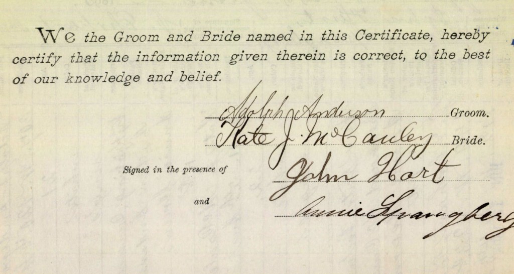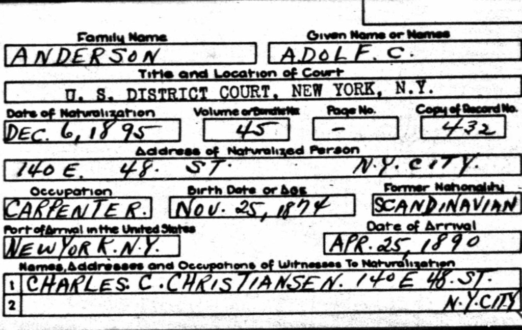 Adolph Anderson was born in Nykjobing Denmark in 1874. He emigrated to the United States with his Parents, Anders Anderson, Annie Jensen and his younger brother Hans Anderson on April 25, 1890, according to Adolph’s naturalization record. I have not yet authenticated the arrival date of Katherine McCauley, but it is estimated to be 1890 according to the 1900 US Censes. Adolph Anderson’s profession was that of a carpenter and became a naturalized citizen on December 6, 1895. That document is below. They were both living in New York and making lives for themselves.