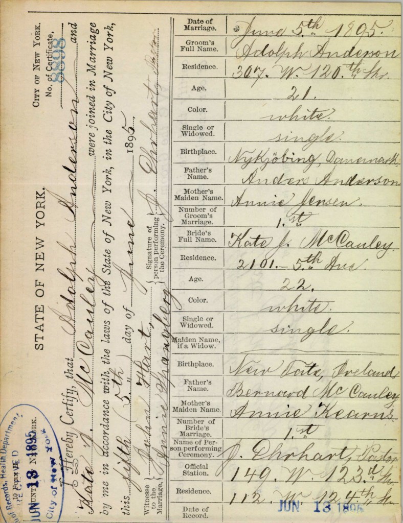 They were married on June 5, 1895, in New York City. Their marriage certificate confirms Katherine’s identity as the document lists Bernard and McCauley and Anne Kearns as her parents and New Tate, Ireland as the place of her birth. Both the bride and groom have Manhattan addresses. Another lovely element is to see their own original signatures on this marriage certificate.