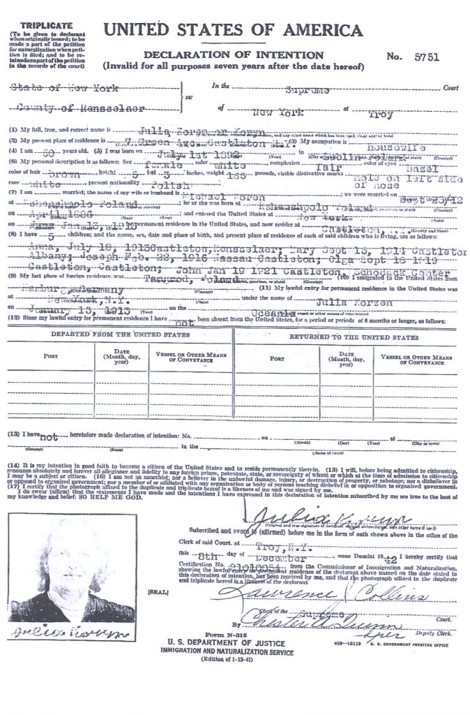 This petition is a declaration of intention to stay in the United States and become a United States Citizen. This petition was completed in 1942 and was probably a more immediate desire considering the United States deep involvement in World War II. I remember Julia speaking Polish with daughter Anna when I was very young. Julia’s spoke with broken English, and I wonder if that made her suspect to those who didn’t know her. Julia signed her application and there is a rare photo of her. I don’t have any other photographs of Julia and so I have tried to use a photo application in order to realize a better image of her. Even with my best effort it is lacking, but I have placed the image below. In future posts, I will explore Micheal’s and Julia’s birth cities and create a family tree.