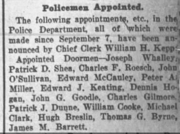 Around 1900, Edward McCauley transitioned his career from that of a Bricklayer to a Patrol Officer in the New York City police force. He was stationed in Brooklyn, New York. The announcement of his appointment appeared on September 29, 1900, Page 1 of the Brookyn Citizen, one of the many daily newspapers of the time. This was a significant accomplishment; to transition from a laborer to a clearly recognizable position in the social establishment. Another difficult job, but a long way from the fields of Fermanagh County, Northern Ireland where, as a Catholic, he may not have felt personal respect or a stake in governance at any level.