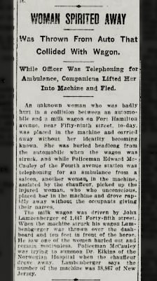 The article below appeared on page 14 of the Brooklyn Daily Eagle on September 14, 1910. The article describes an accident involving a milk wagon and one of those new-fangled motorized vehicles. The driver of the motorized vehicle collected their injured passenger and fled the scene. The vehicle was registered to the owner who lived in New Jersey. A motorist from New Jersey perpetrating a hit and run accident in Brooklyn? I guess things haven’t changed much since the previous century! I have posted the article in its original form and hope all are able to read it regardless of the format you are using to read this blog.