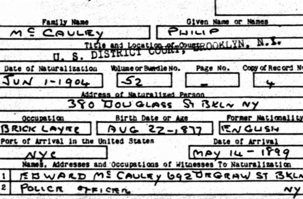 According to the manifest below, (Bernard’s entry on the bottom line) his plan was to stay with his brother Phillip at 208 East 117th Street in New York City. A cross-check with Phillip’s documents, specifically, his naturalization card signed on June 1st, 1904, shows an address of 380 Douglas Street, Brooklyn, NY. So that is where Bernard (II) probably stayed for a while. Interesting to note on Philip McCauley’s naturalization card that his sponsor was none other than his older brother, Edward McCauley, who was a police officer at that time. Each brother using their standing to help the other.
