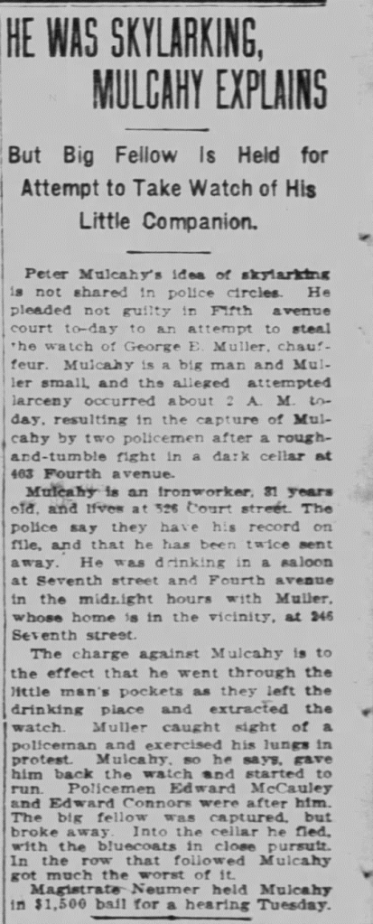 The article below was published in the Standard Union Newspaper, Brooklyn NY, on August 19, 1915. The accused said he was “Skylarking” or fooling around, but the victim and patrolman felt differently. Edward would have been 52 years old when he and his partner Edward Collins apprehended the suspect Peter Mulchay after an apparently aggressive and combative interaction. A patrolman’s beat was pretty tough and tumble at times.