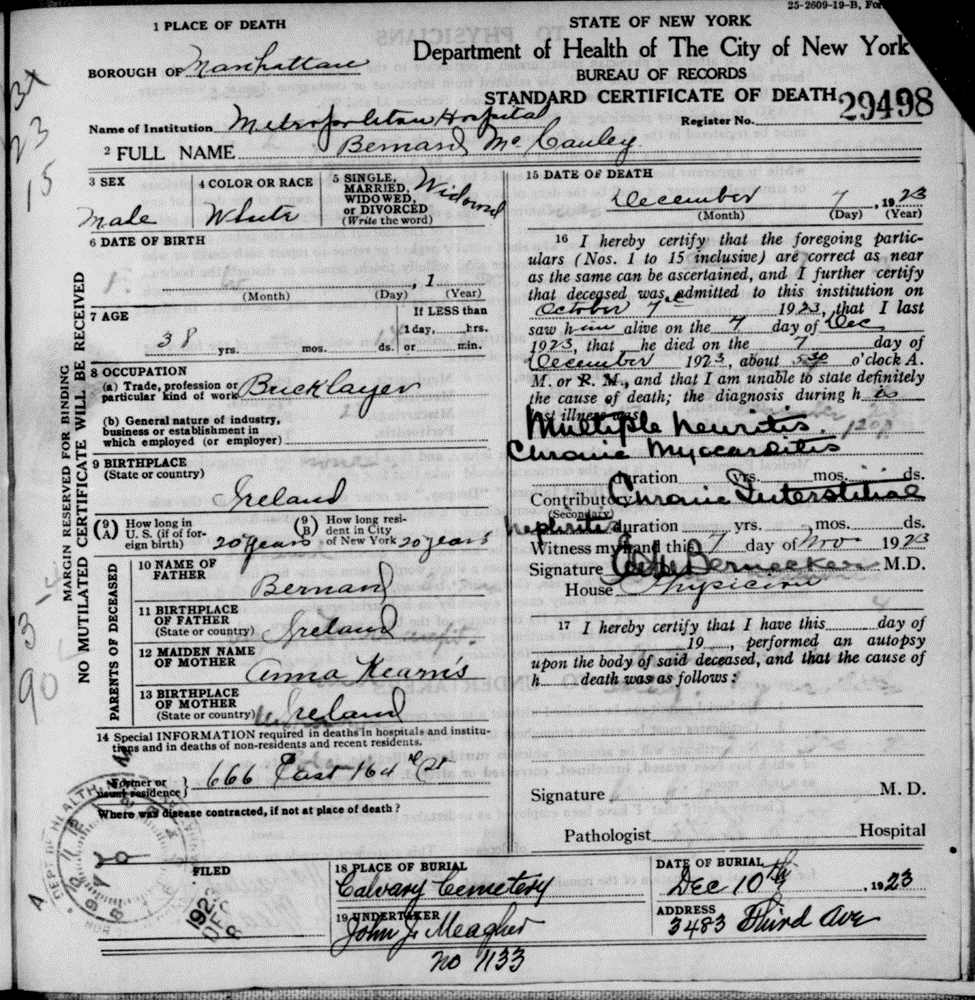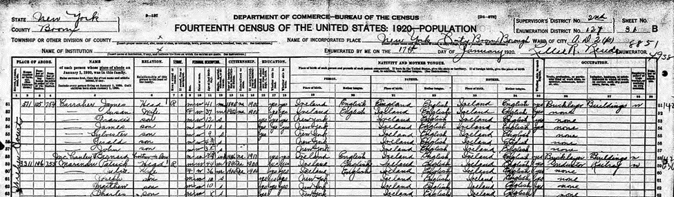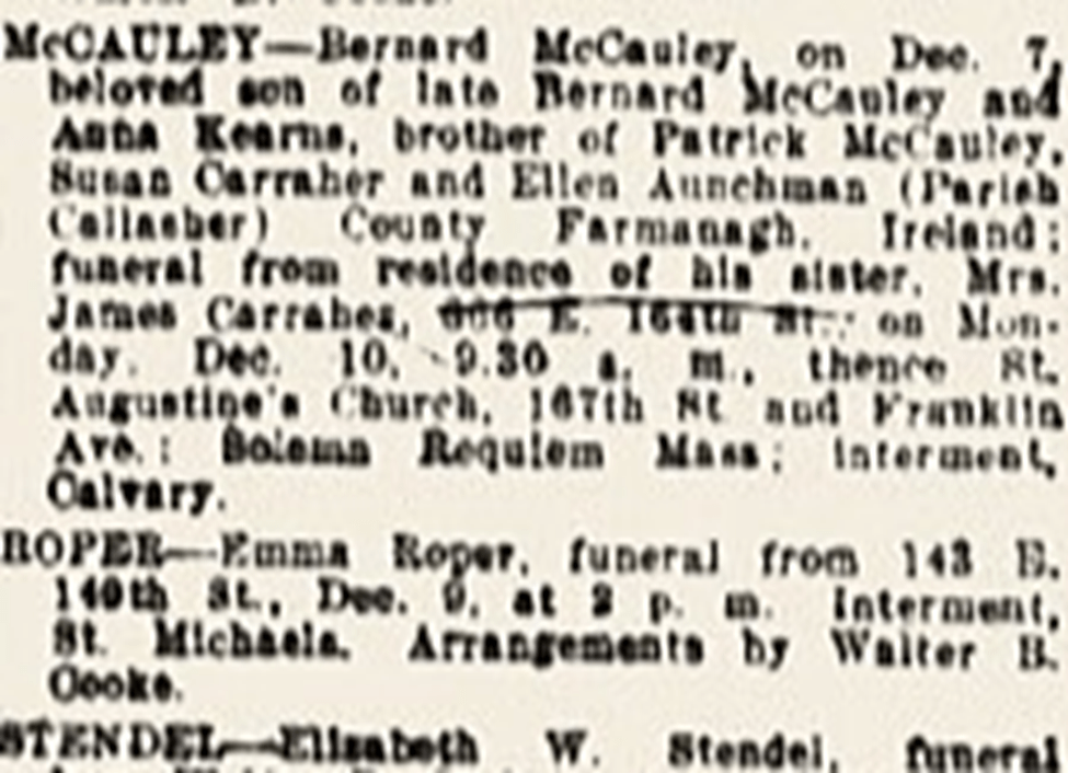 The 1920 US census form documents Bernard McCauley as living with his sister Susan Carraher and her family; husband James Carraher, and the five boys Francis, James, Ignatius, (although the censes form indicates a Sylvester, this must have been an error.), Gerald and John. They are living at 511 Wisher Street in the Bronx, NY. At some point before December 7, 1923, the Family moves to 606 164th Street in the Bronx.