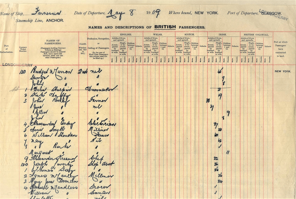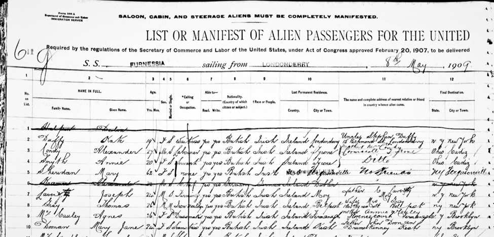 I could not find a definite date of Agnes’s return to Ireland, but on the travel manifest for 1909 she indicates she previously had visited the United States in 1905 and returned to Ireland in 1907. The August 1909 travel manifest for her indicates that Agnes is traveling to Brooklyn to stay with Edward McCauley at 692 DeGraw Street in Brooklyn NY. Her occupation is listed as Dressmaker and Millner, a hat maker. The ship manifests for the 1909 trip are below.