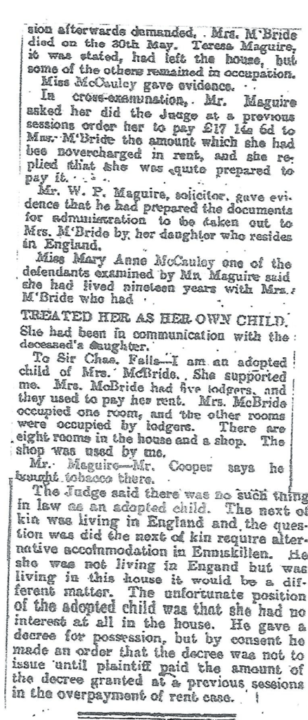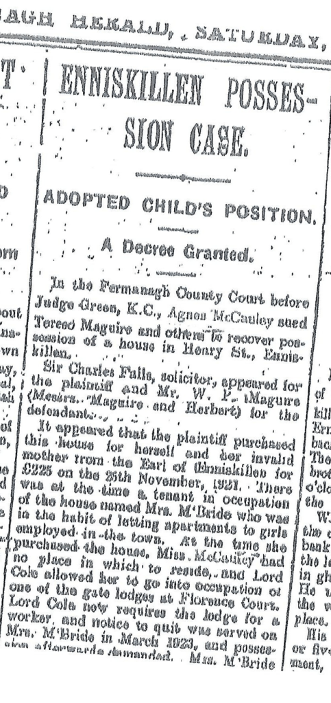 The facts from the article are that Agnes had purchased a house in Enniskillen for herself and her mother in 1921. They had been living in one of the gate houses on the Florence court estate. One of the tenants who remained thought she had a claim to the property based on her claim that she was adopted by another tenant who had previously passed. In the end a judgement was made for possession of the property by Agnes McCauley if overpaid rent was restored to the tenant. There is no indication of what had happened with the farm, although I have not been able to establish if that land was ever owned or rented. As a history marker this was after WWI and the Irish Civil war. The description of the house in Enniskillen includes eight rooms and a shop. I have wondered if Agnes had used the shop for her dress and hat making abilities.