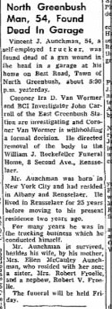 I don’t remember meeting Vincent Aunchman or his wife Thelma Face. I would have been two years old when he passed away. I am told he had a cleft pallet and one of his arms was shorter than the other and these physical traits were often underappreciated by people who did not know him. He gravitated to independent labor, working as an ashman in Albany. In the days of heating a home with coal, a person was needed to not only deliver coal, but also to remove the ash from the furnace to be dumped elsewhere. These are both high labor and messy tasks. In later years he ran his own small trucking concern. He married Thelma Face in November of 1936. In 1940 they were living on Clinton Street in Albany not far from His sister Gladys on Second Avenue. Thelma would go on to work as a file clerk in the New York State Tax department. The couple lived in Albany and moved out to Best Road in North Greenbush, Rensselaer, County in 1960. In 1964 Vincent died tragically from a gunshot wound while cleaning his rifle. Thelma Face died in 1988.