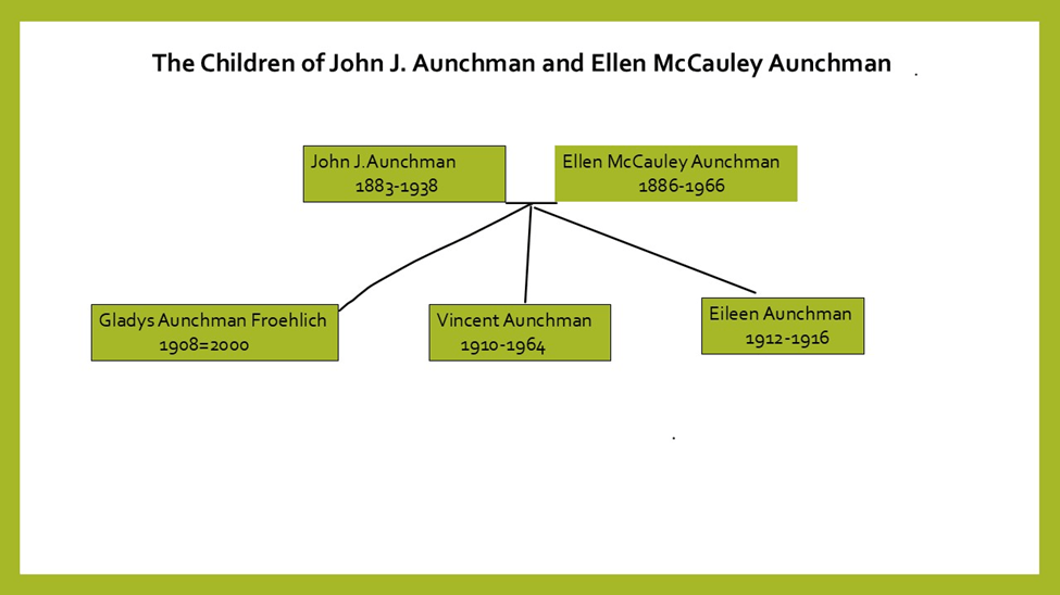 John Aunchman was born in Vermont, USA in 1883 where he lived on a dairy farm. The Aunchman family were of English descent. His occupation was listed as a salesperson and from what I gathered, came to New York to sell milk and other farm produce to markets in New York City. Lost to time is the story of how they met, but considering they both lived in New York City, and each had the experience of living a rural farm life, one could see that they had that common bond.