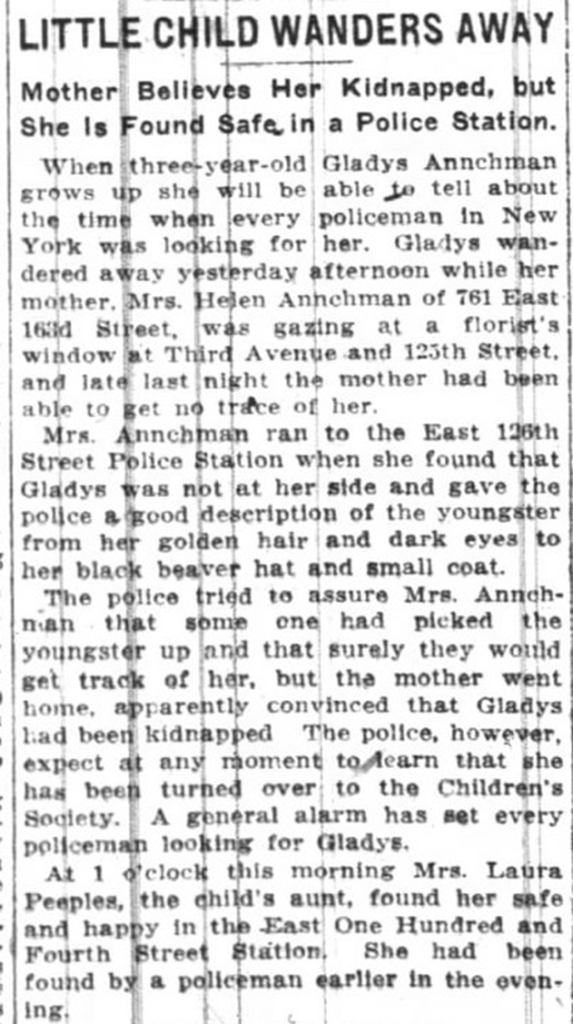 I came across this clipping while searching for information on the family. The article was published on April 14, 1911, in the New York Times. There are several errors which one can suggest are transcription errors, but the core of the story holds that the mother in this story is Ellen Aunchman and Gladys is the daughter. Apparently, Ellen lost track of Gladys while she was window shopping. There is no mention of Vincent who would have been about 1 year old.