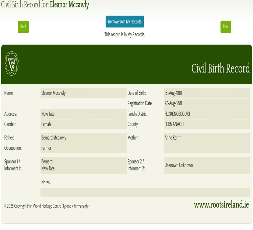 Sometimes the answer is partially in front of you. I have been searching for birth records for all of the Children of Bernard McCauley (I) (1830-1902) and Anne Kerrin (1842-1928) and could not find one for their daughter Ellen McCauley. In corresponding with staff from the Fermanagh Genealogy Center for an upcoming visit, they sent the following birth record for Elenor McCawly. At first, I thought this was a mistake and then thought it could be a child that may have died early in life. Further scrutiny of the birth order of the children yielded the discovery that the birth dates for Ellen McCauley in other documents matched the birth date of Eleanor McCawly and in fact the birth parents matched as well. It then made sense; Elenor is Ellen. She had adopted and used the shorter name Ellen all her life and the E she used as her middle initial was for her given name Eleanor. I doubt that without another person pointing this out, and with the alternative spelling of the last name, that I would never have identified this record. Thanks to the Fermanagh Genealogy Center Staff I now have birth records for all ten of the children of Bernard McCauley and Anne Kerrin.