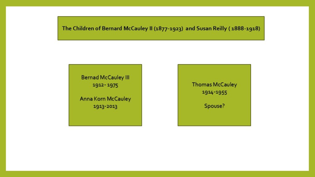 Bernard McCauley (II) (1877-1923) married Susan Reilly (1888-1918) in 1911 and in 1915 were living at 1118 Washington Avenue in the Bronx in the same building as James and Susan Carraher. Susan McCauley Carraher was Bernard’s younger sister born just after him. Bernard McCauley and Susan Reilly had two sons before Susan passed away in 1918. Both sons, Bernard (1912 -1975) and Thomas (1914-1955) were later admitted to the orphanage at Mount Loretto, New York, as Bernard had become injured in an accident while working on the construction of the subway system in New York.