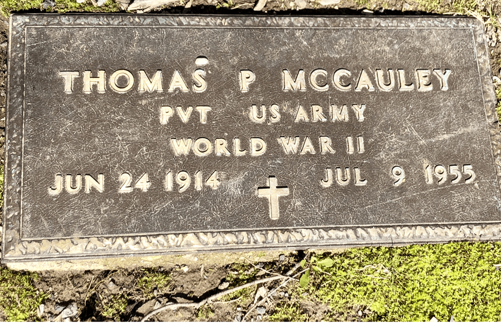 Thomas Patrick McCauley is buried in Holy Sepulcher Cemetery in Rensselaer, NY. Anna McCauley helped to secure him a burial plot and applied for his military burial benefit.