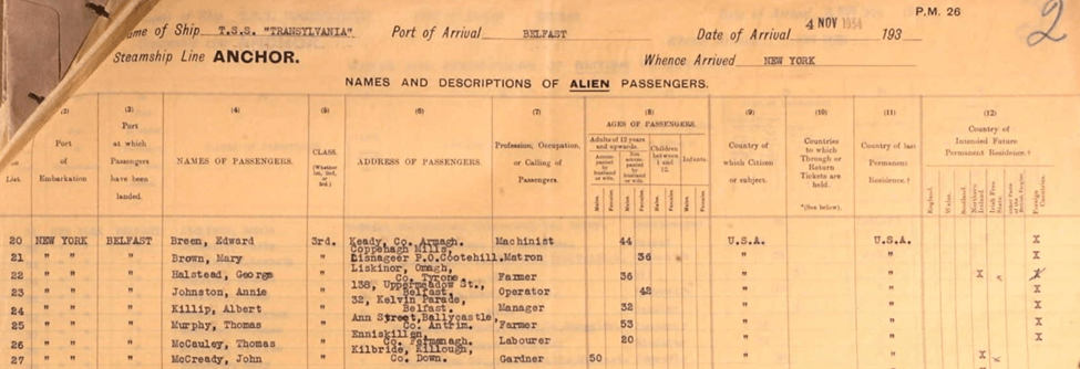 Thomas took a trip to Ireland, perhaps in the hope of moving there. The passenger manifests below document his trip in November 1934. The only close relative in Enniskillen at the time was Agnes McCauley-Kelly. Upon examination of both passenger manifests, one can conclude that the visit lasted only one month. Aunt Patricia passed a comment once that she understood Thomas did not like it there as Agens him smoke and play cards in the barn. There are similar indications in my father’s notes. Below are the travel manifests documenting Thomas’s travel to Enniskillen and his return. The return trip manifest has a return address at 276 Meagher Drive in the Bronx. The address of the Carraher family.