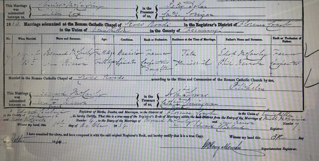 How can I sure this name represents the Edward McCawley that is Bernard’s father? I posed this question to the local genealogist Frankie Roofe. I told him that I completed several searches using different search engines including the Public Record Office of Northern Ireland and had found several Edward McCauley’s in Northern Ireland, but none in Fermanagh County that would be of the age to have fathered Bernard in that time period. Considering the rural setting of Fermanagh County and the sparse population relative to others, he concluded it was a good bet that this document represented the Edward McCawly that was Bernard (1st)’s father.
