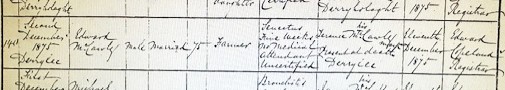 His is entry 140 for the year 1875. Date of death was second of December, in the year 1875, and Derrylea was the location. Edward McCawly, male, married, 75 years old. His occupation is listed as a Farmer. The first word in the case box is hard to read, but the rest says, “Five Weeks no medical attendant, uncertified.” It appears he was sick for five weeks and there was no medical attended to certify a specific cause of death. The next box indicated that a Terrance McCawly was with him at the time of death. In that box there also appears to be two words that say “His Neph”, short for his nephew? The date was reported is listed as December 11, 1875. Derrrylea is today and was in 1875 was a rural farming country. There is no mention of his wife. Another mystery and potential clue, who is Terrance McCauley? Who was he and how does he fit into the family?