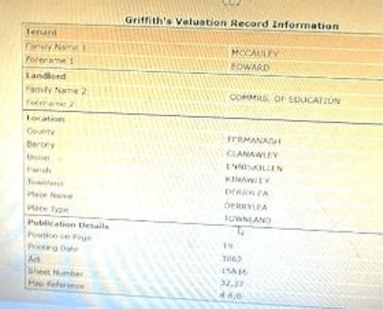 More information on Edward was gleaned n reviewing and understanding Giffith’s land valuations. These were the records that the governing bodies used to assess land taxes. They can be found digitally stored and organized through the Public Records office of Northern Ireland Website. Below is a screenshot of that entry. The information from this entry is from 1867 and Edward would have been 67 years old. I surmise that by that date Edward McCauley had moved from Newtate road and acquired land in nearby Derrylea. This is approximately 4 miles from St Nailes church and cemetery where Bernard McCauley and Ann Kerrin-McCauley are buried. This fact only points out a familiar relationship the family held with that geographic area.