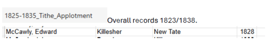 A recent trip to Ireland led to the following discovery. With the consultation of Frankie Roofe, a local genealogist and historian, I was able to access to the Tithe records of the Catholic church for Fermanagh County, Northern Ireland. Below is a transcribed index of the Tithe record for the Edward McCawly. This shows he had paid his tithe to the local parish in 1828. He was living in Newtate in 1828. The area is adjacent to the Florencecourt Estate. Newtate and its road is where Bernard McCauley (1) would live.