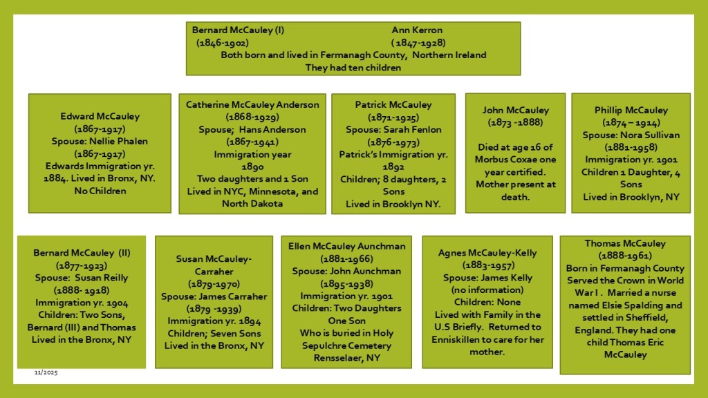 This is an updated Family tree (November 2025) for the McCauley Family who resided in Fermanagh County, Northern Ireland in the late 1800’s. In the Summer of 2022, I completed a project to find birth or baptism certificates for all of the children and in 2025 found a birth certificate for Ellen, formally named Eleanor McCauley.